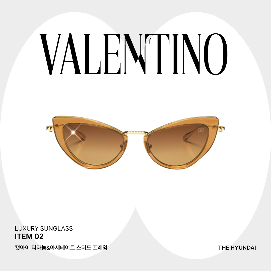 브라운 컬러의 아세테이트와 라이트한 옐로우 골드 컬러의 티타늄 소재가 조화를 이룬 캣 아이 선글라스도 매력적입니다. 안경다리에는 스터드 장식과 입체적인 느낌의 템플 팁이 들어가 있으며 도수 삽입 또한 가능한데요. 발렌티노 특유의 정적이면서 우아한 느낌이 살아 있어 포멀한 룩에도 함께 연출하기에 좋습니다.